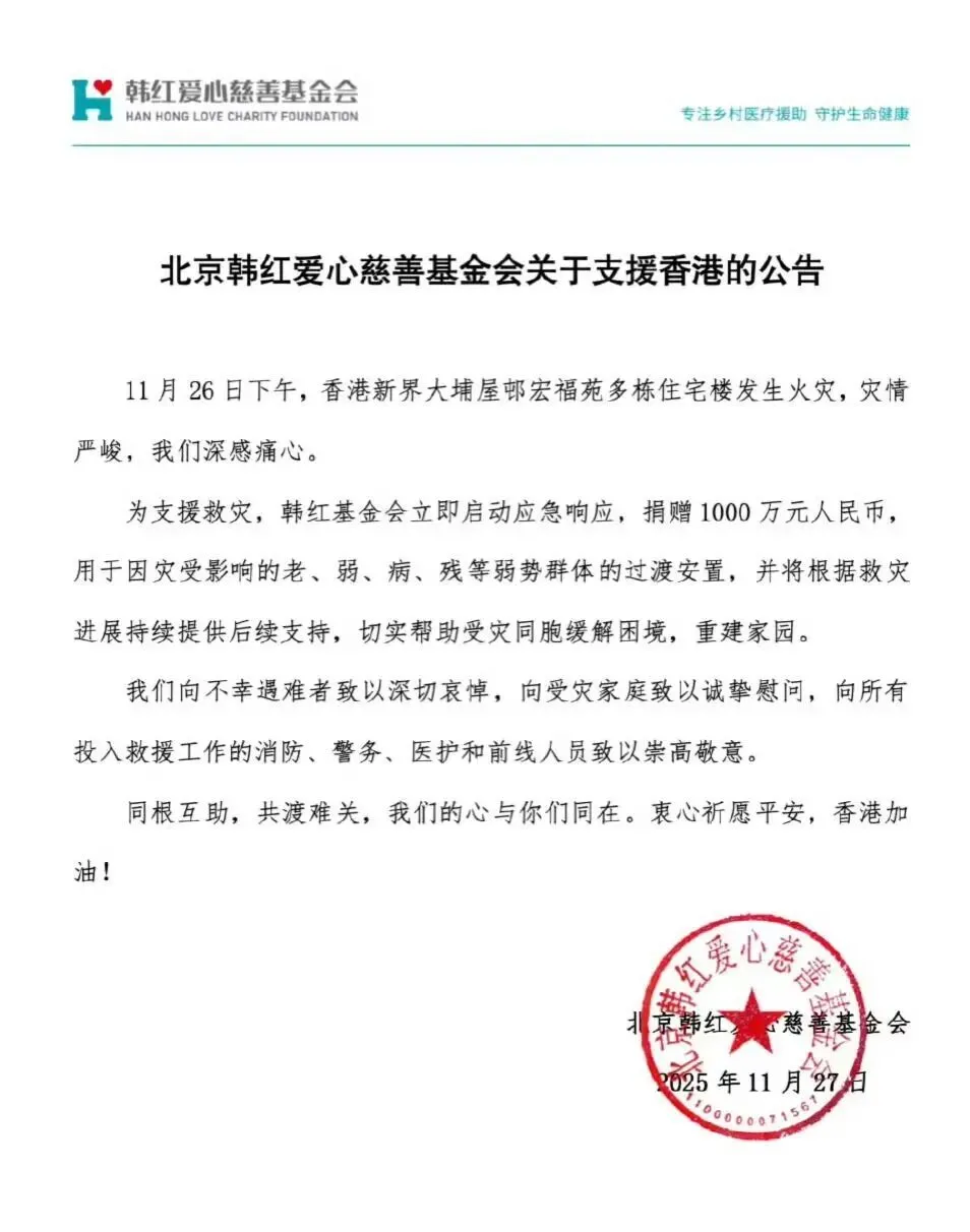 11月26日,香港大埔宏福苑多栋住宅楼发生火灾,面对严峻灾情,社会各界驰援救灾工作,影视界名人也纷纷献出爱心。