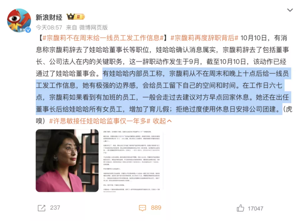 不过依然有网友对宗馥莉持支持态度,认为“大女主”是在拿回她应得的。还有娃哈哈内部员工对宗馥莉的工作表示认可,称宗馥莉从不在周末和晚上十点后给一线员工发工作信息,她有极强的边界感,会给员工留下自己的空间和时间。在工作日六七点,宗馥莉如果看到有加班的员工,一般会走过去建议对方早点回家休息。她还在出任董事长后给娃哈哈所有女员工,增加了育儿假;拒绝过度使用休息日安排公司团建。