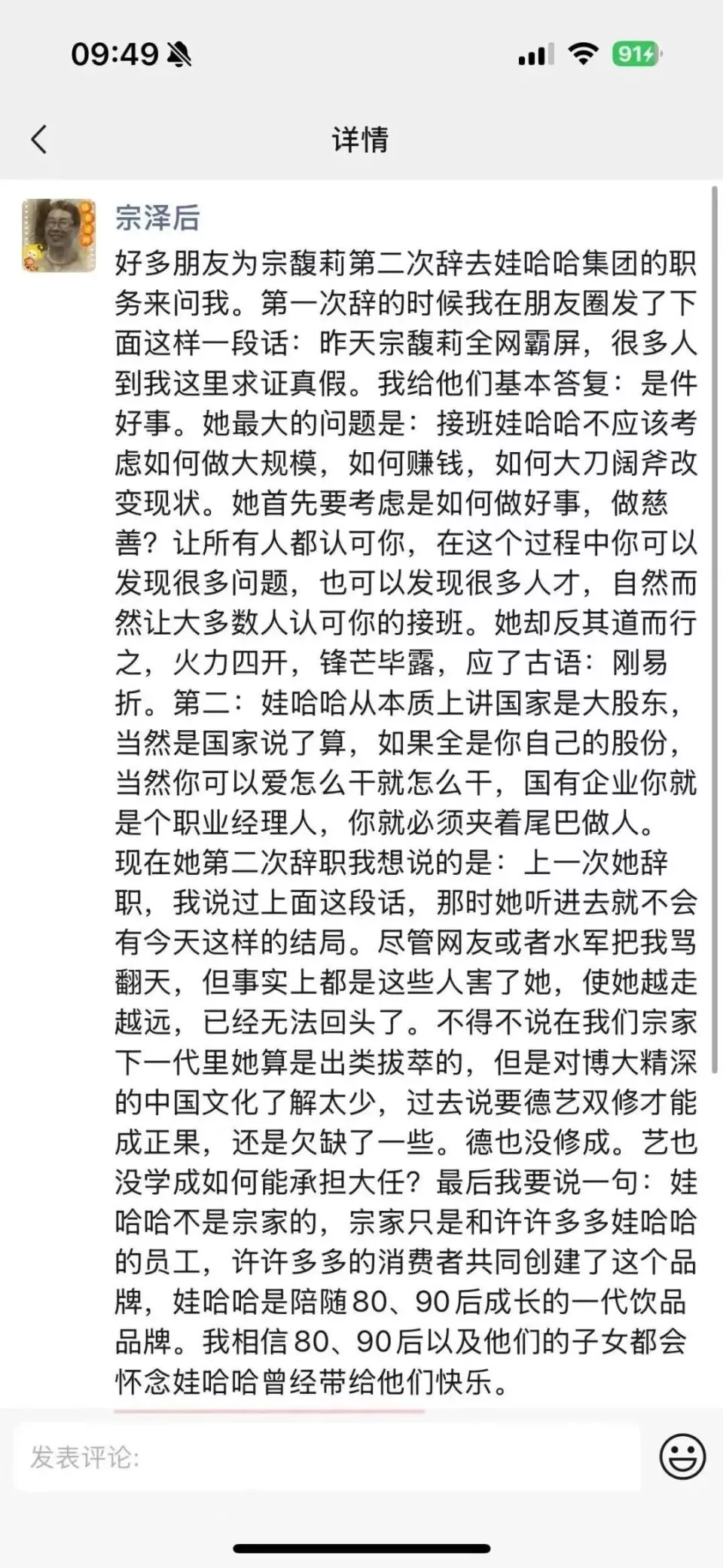 宗馥莉第二次从娃哈哈集团辞任时,宗泽后再次从朋友圈发表评论。他写道:“尽管网友或者水军把我骂翻天,但事实上都是这些人害了她,使她越走越远,已经无法回头了。不得不说在我们宗家下一代里她算是出类拔萃的,但是对博大精深的中国文化了解太少,过去说要德艺双修才能成正果,还是欠缺了一些。德也没修成。艺也没学成如何能承担大任?最后我要说一句:娃哈哈不是宗家的,宗家只是和许许多多娃哈哈的员工,许许多多的消费者共同创建了这个品牌,娃哈哈是陪随80、90后成长的一代饮品品牌。我相信80、90后以及他们的子女都会怀念娃哈哈曾经带给他们快乐。”