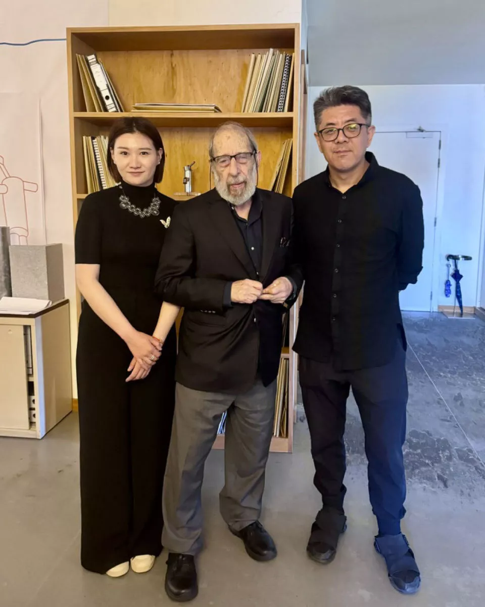 阿尔瓦罗·西扎(中)和中国建筑师马岩松(右)、纪录片《我与建筑师有个约会》的制片人朱丽康合影 图/受访者提供