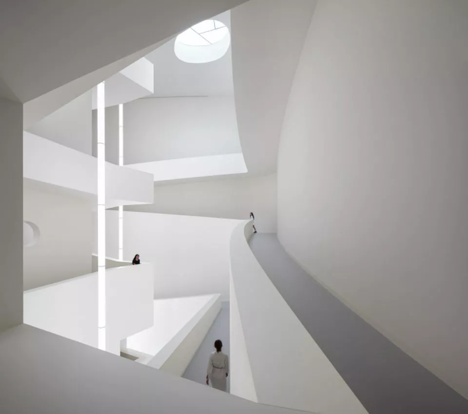 对西扎而言,颜色从来都不是预设的答案,而是与环境的对话。他为杭州建造的中国国际设计博物馆选择了自然古朴的砖红色,而在宁波的华茂艺术教育博物馆则出人意料地运用了大面积的黑色。“不是纯粹的黑色。”西扎解释,建筑外墙波纹铝板的色彩实际上会随着周围的光线而变化,在特定的天气和时间会呈现为璀璨的银色。“它是我脑海中的黑色,来自东钱湖湖水的深度。”