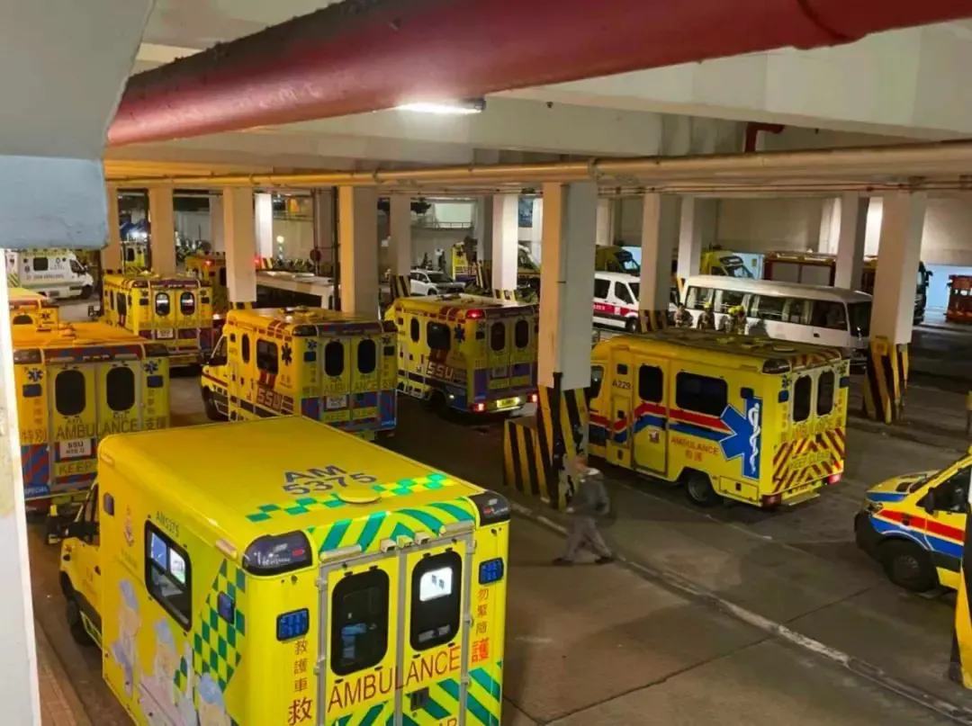 (火灾大楼附近车库中等待的救护车,拍摄/黄思韵)