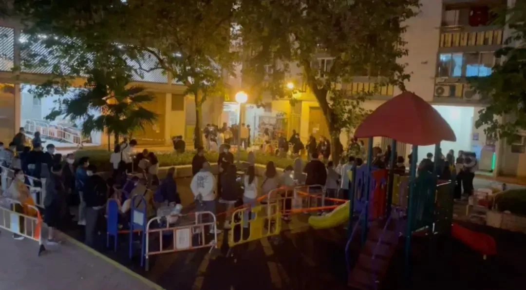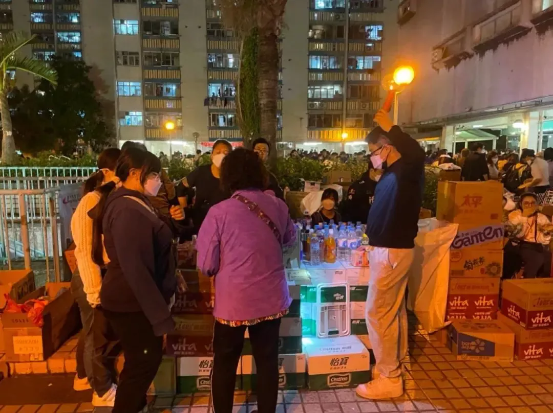 在广福邨广栋楼,一对夫妻提了两三袋行李,他们告诉《财经》,不知道会封锁到哪天。27日晚上7点多,居民们在楼下围成圈排队,听指挥喊楼层业主,他们有10分钟时间可以上去拿行李。