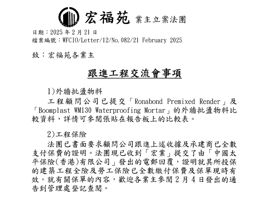宏福苑业主立案法团网站此前披露的信息显示,2025-2026年度屋苑向“中国太平保险(香港)有限公司”投保,投保期为2025年1月1日至2026年12月31日。