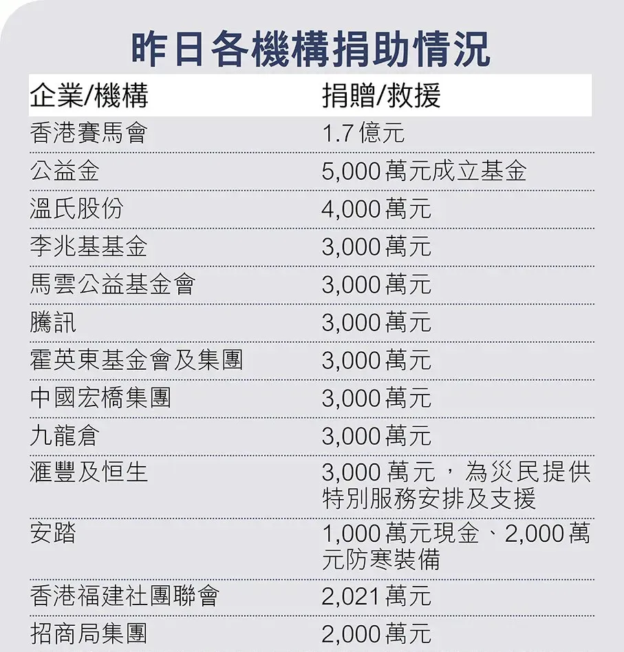 其中,香港赛马会宣布捐出约1.7亿元,包括向死者家属发放15万元、严重伤者10万元、一般伤者5万元紧急援助金,并为搬迁家庭及过渡房屋提供资助及家具。李兆基基金、九龙仓、马云公益基金会、腾讯、汇丰和恒生、中国宏桥等各捐3,000万元。