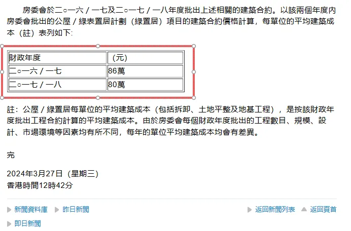根据香港房屋委员会2024年3月披露的信息,近年完成的公屋重建项目,每单位平均建筑成本(含拆卸、土地平整及地基工程)约为80-86万港元。宏福苑共1984户,主体建筑重建至少需要15.87亿至17.06亿港元。