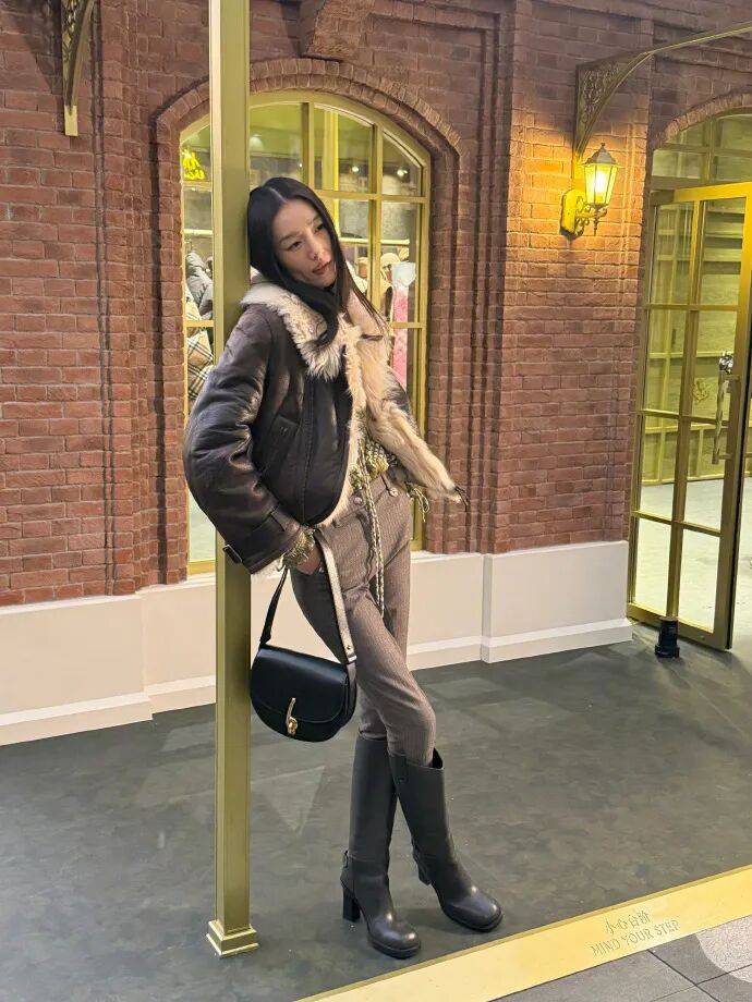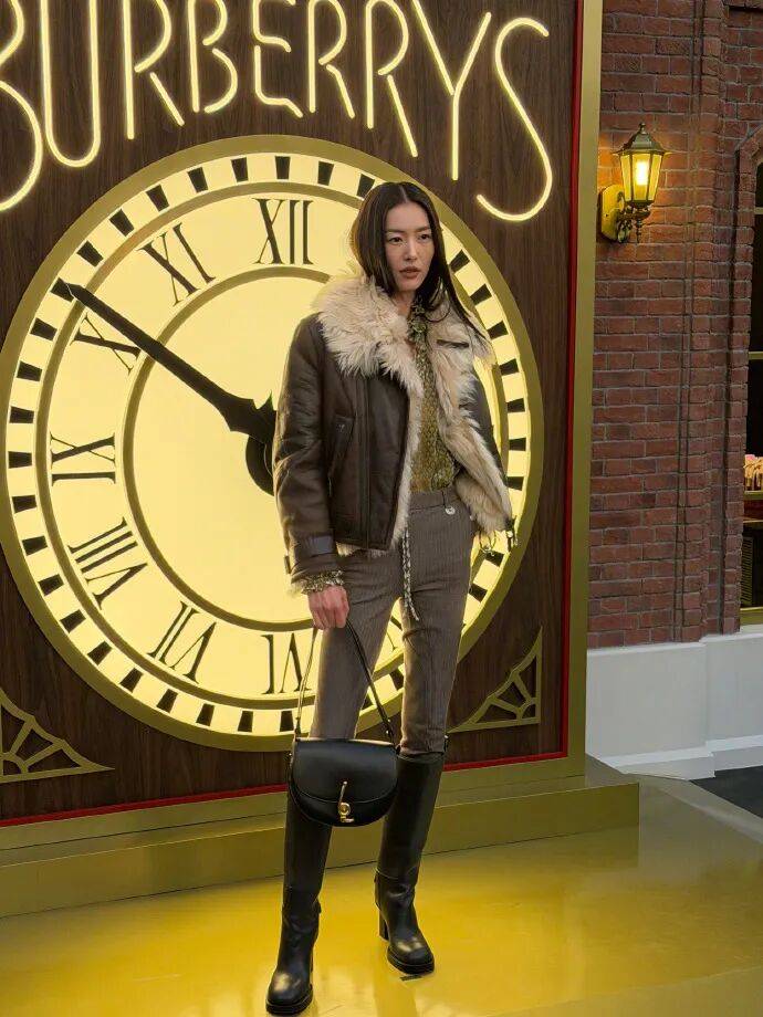 2025年11月28日,刘雯作为Burberry全球代言人亮相品牌限时精品店开幕活动,身着秋冬系列短款羊毛领皮夹克、紧身皮裤及同色尖头长靴,内搭华丽感衬衫,修长的大美腿,绝对美爆了。