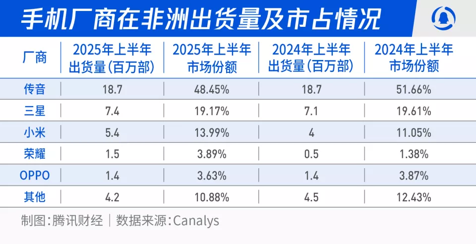 Canalys数据显示,小米2025年上半年在非洲市场手机出货量达到540万部,较2024年同期增加140万部,市场份额提升至13.99%。荣耀在增速上表现更为抢眼,今年上半年出货量激增200%至150万部,市场份额从1.38%大幅提升至3.89%。