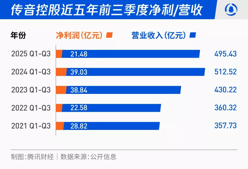 如果从更长周期看,今年前三季度是传音控股近5年来净利润表现最差的一个财季,此前2024年前三季度传音控股净利润39.03亿元,2023年前三季度净利润38.84亿元,2022年前三季度净利润22.58亿元,2021年前三季度净利润28.82亿元。