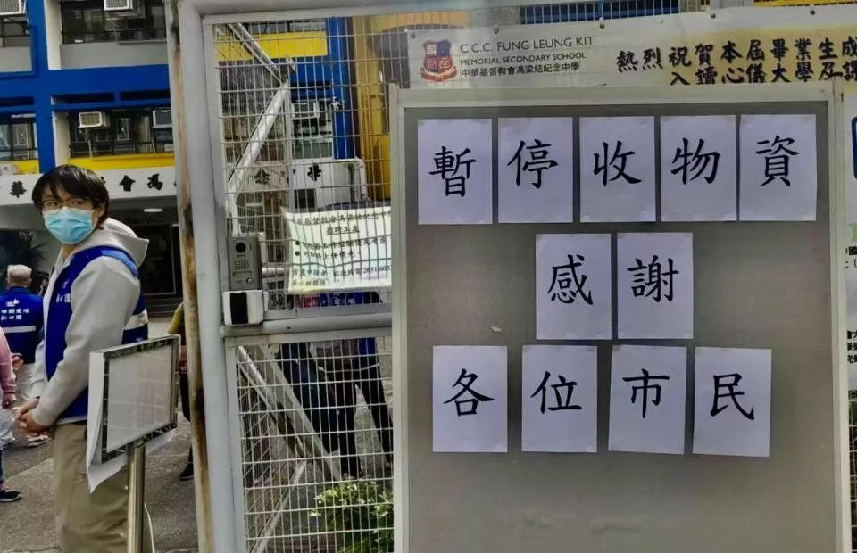 11月27日,香港大埔宏福苑附近一处庇护中心外,提醒“暂停接收物资”。图/王瑭琳