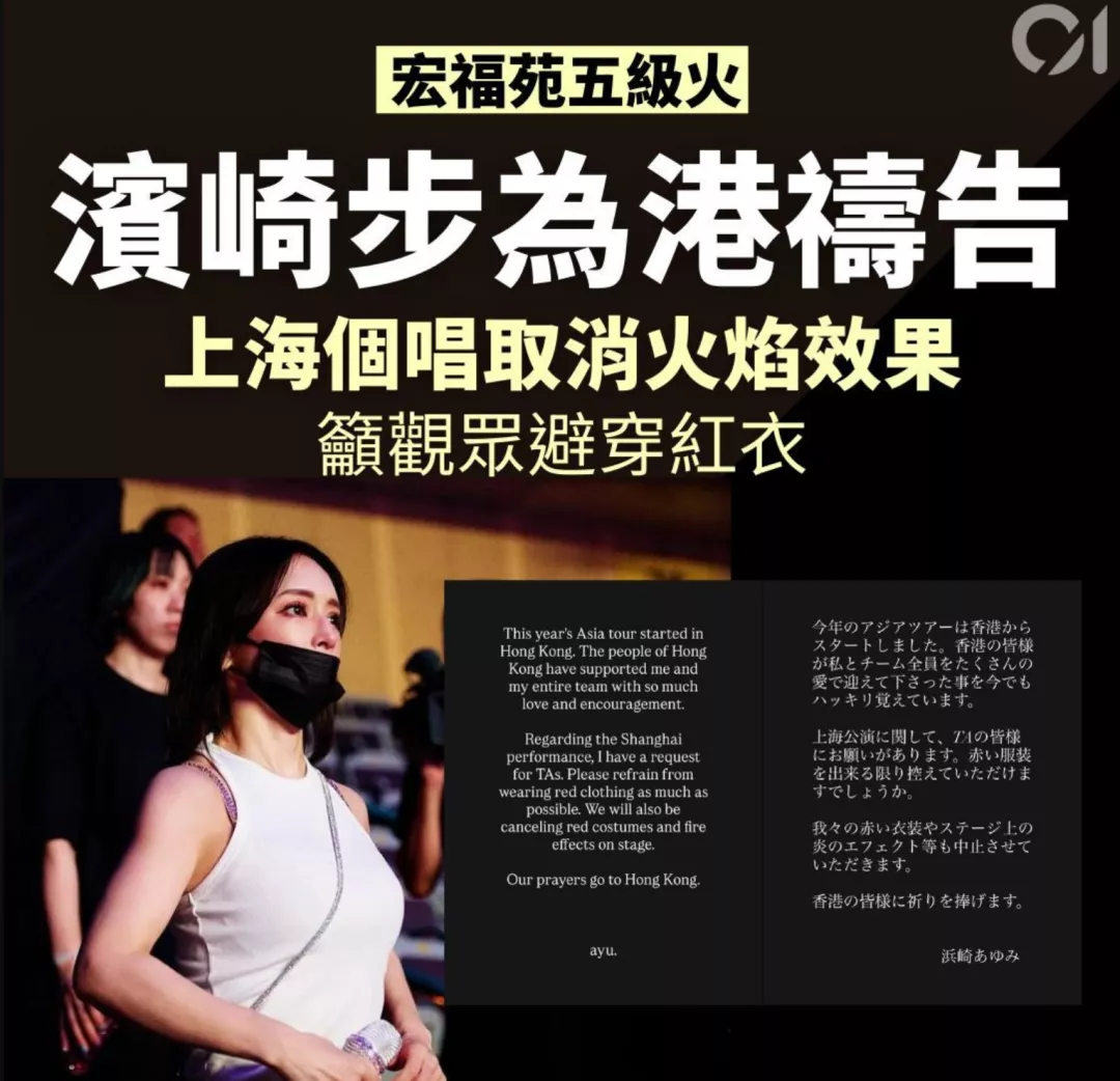 特别一提的是,昨日滨崎步还发布公告,表示考虑到香港(专题)火灾,会取消上海演唱会的火焰效果,以及不穿红色演出服,没想到今天演出直接取消了。