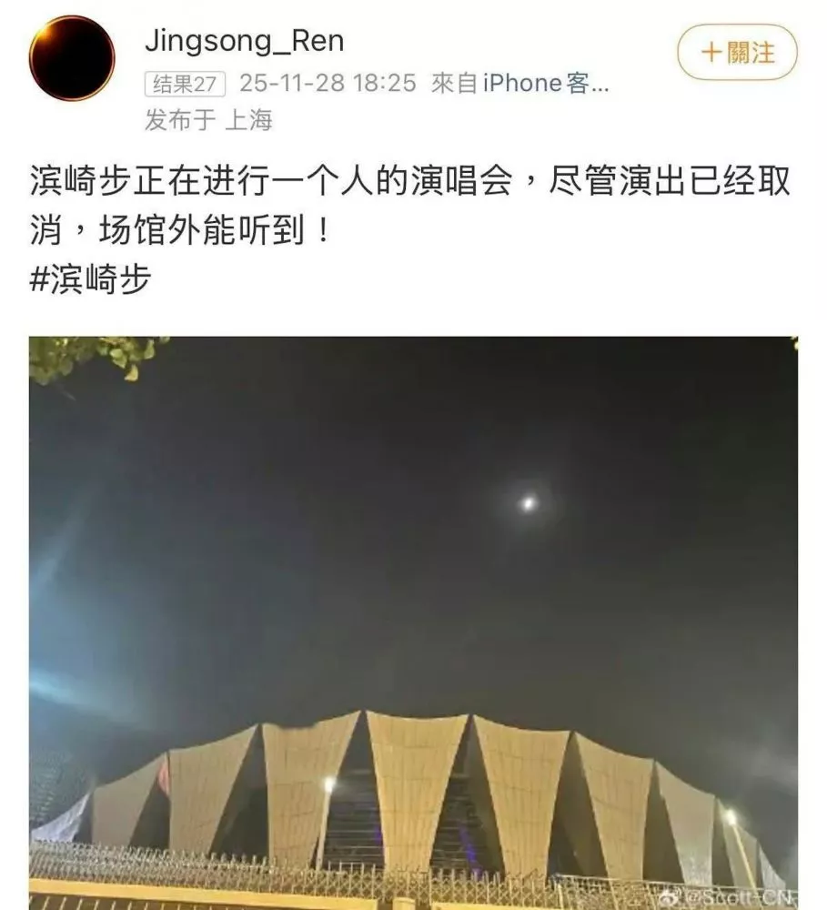 然而在昨晚,有上海网民上载会场外围相片,表示︰“滨崎步正在进行一个人的演唱会,尽管演出已经取消,场馆外能听到!”网上亦流传一张疑似会场内进行演唱的相片,写道︰“滨崎步独自在空无一人的演唱会表演。”