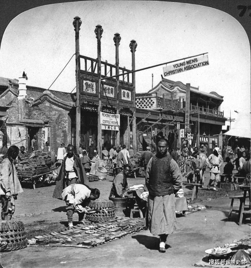 这是20世纪初的珠市口,路边是同信恒绸缎洋货铺,门脸上挂着用英文写的“基督教青年会读书、写作和咖啡厅”的幌子。珠市口是老北京中轴线南端的十字路口,曾因生猪交易得名“猪市口”,清代改为“珠市口”以雅化地名。其北侧集中了会馆、戏楼、商铺等高端场所,南侧则逐渐发展为平民聚集区。20世纪初的珠市口是北京南城的重要商业和文化中心,热闹程度与前门地区相当。
