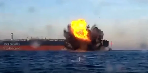 根据SBU发布的袭击视频,装满炸药的乌克兰无人艇高速冲向油轮,随后油轮发生爆炸并起火。
