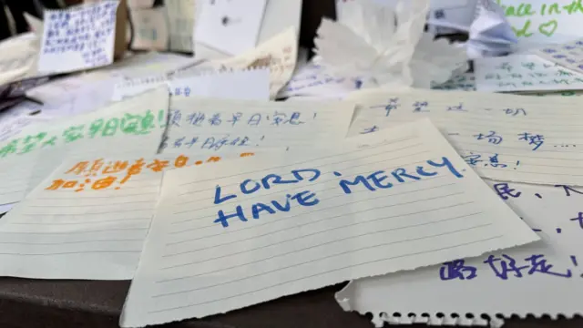 图像来源,BBC NEWS CHINESE图像加注文字,2025年11月30日,哀悼者在宏福苑旁的花园里敬献鲜花,悼念逝者