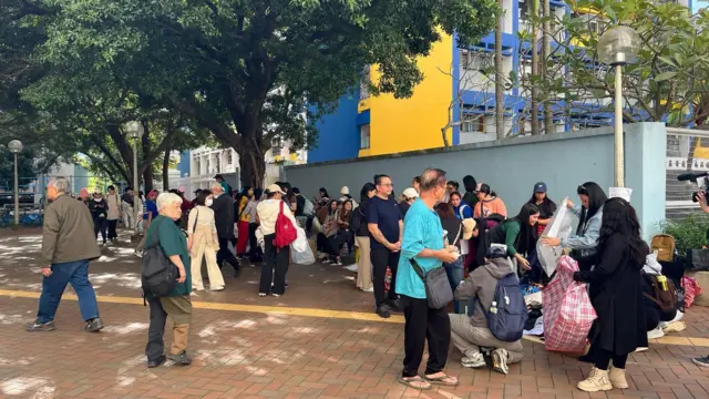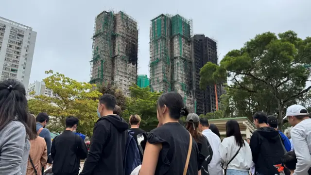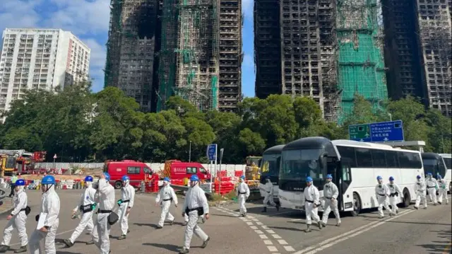 图像来源,BBC NEWS CHINESE图像加注文字,周六(29)日上午搜救及灾难遇害者辨认组陆续到宏福苑。