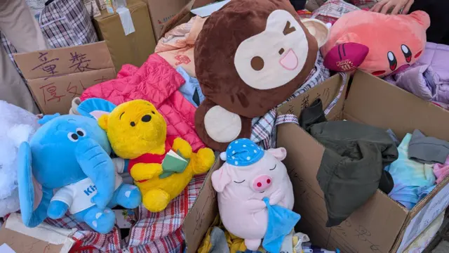 图像来源,BBC NEWS CHINESE图像加注文字,邻近大埔宏福苑的广福邨平台,现场设置多个巿民自发的物资站。