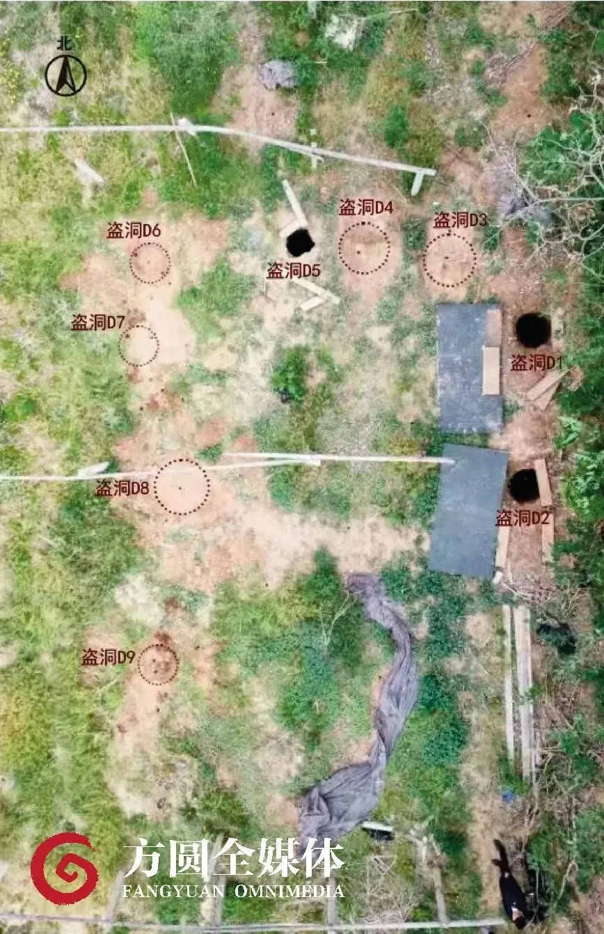 无人机航拍的9处盗洞损毁情况。(图片来源:受访者供图)