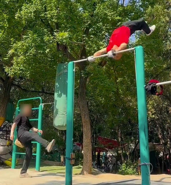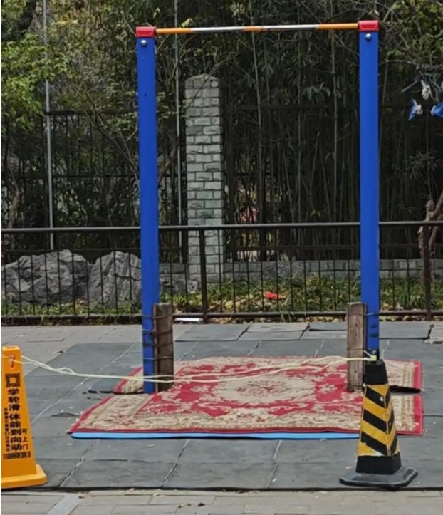 进行大回环锻炼的单槓高约2米多,附近常有老人来到单槓处做引体向上等动作,也有人在单槓上做大回环,但是比较少,报道指老人出事之后,该健身区就没有人再做这个动作。