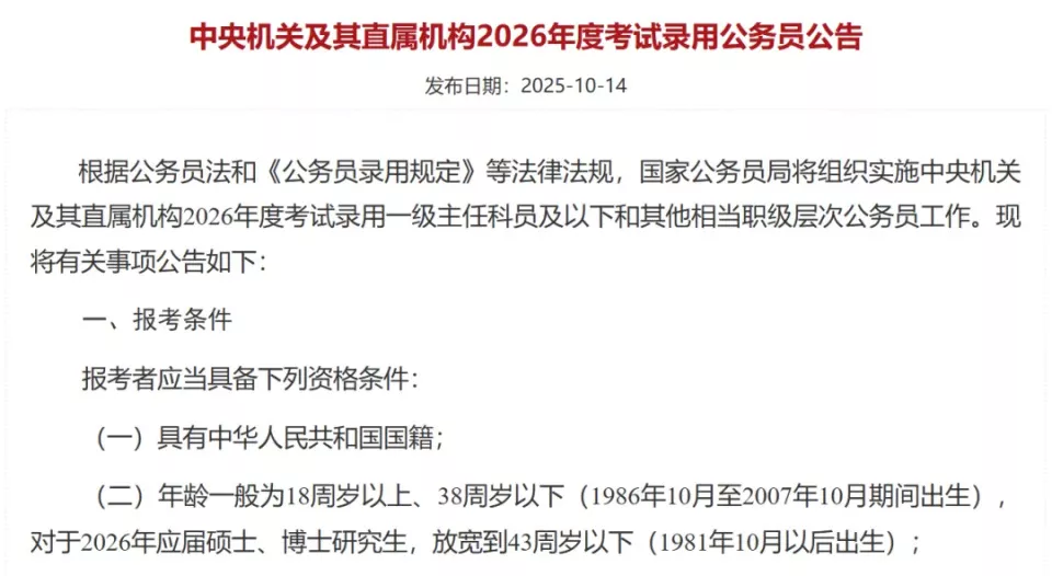 今年国考放宽了年龄限制,普通考生从35周岁放宽到38周岁,应届硕博放宽到43周岁。