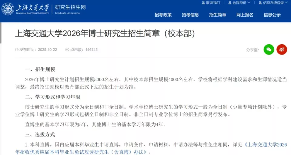 近期典型的新闻来自上海交大的新闻——预计2026年招5000名博士生,这一数字超其2025年入学本科生数,其中非全日制博士以及在职博士项目占比46%,最高每期学费达78万元。