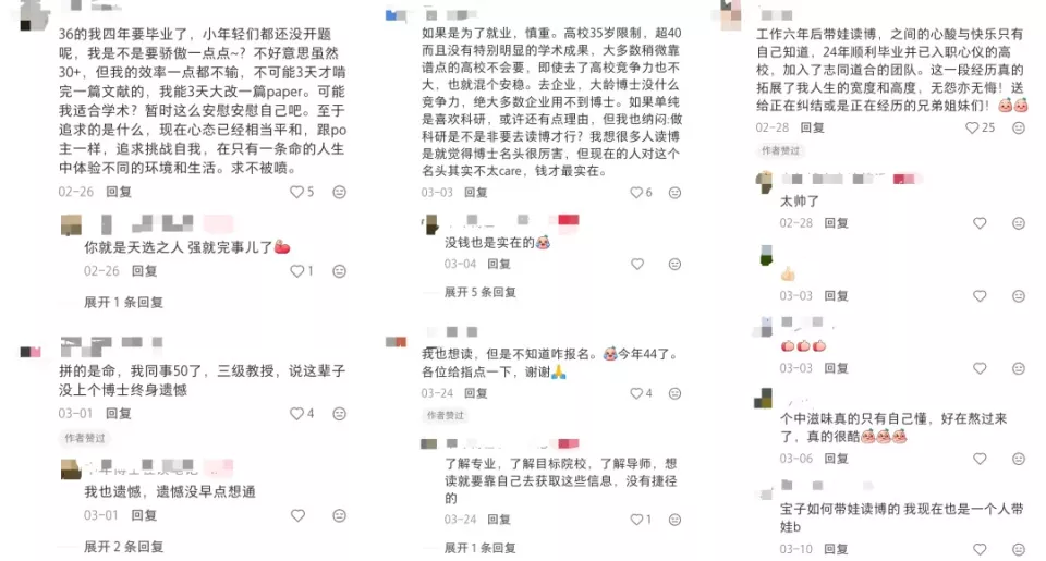 “如果现在是1,无非就是看读博会不会给你带来另外一个1,也可能是1+1还是那个1,但是你经历过,感受过,人生就没有遗憾。读了会后悔一阵,如果不读大概就是一辈子的遗憾。”一位她的粉丝这样说道。
