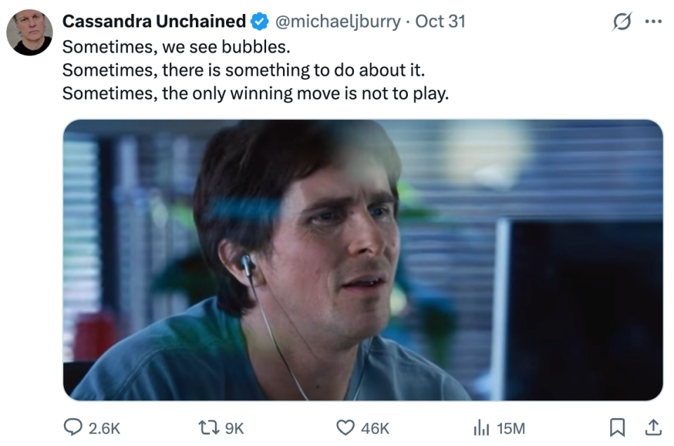 2025年10月31日,他在X上写道:“有时候,我们能看见泡沫。有时候,我们能对此采取行动。而有时候,唯一能赢的做法,就是不参与。”伯里拥有160万粉丝。