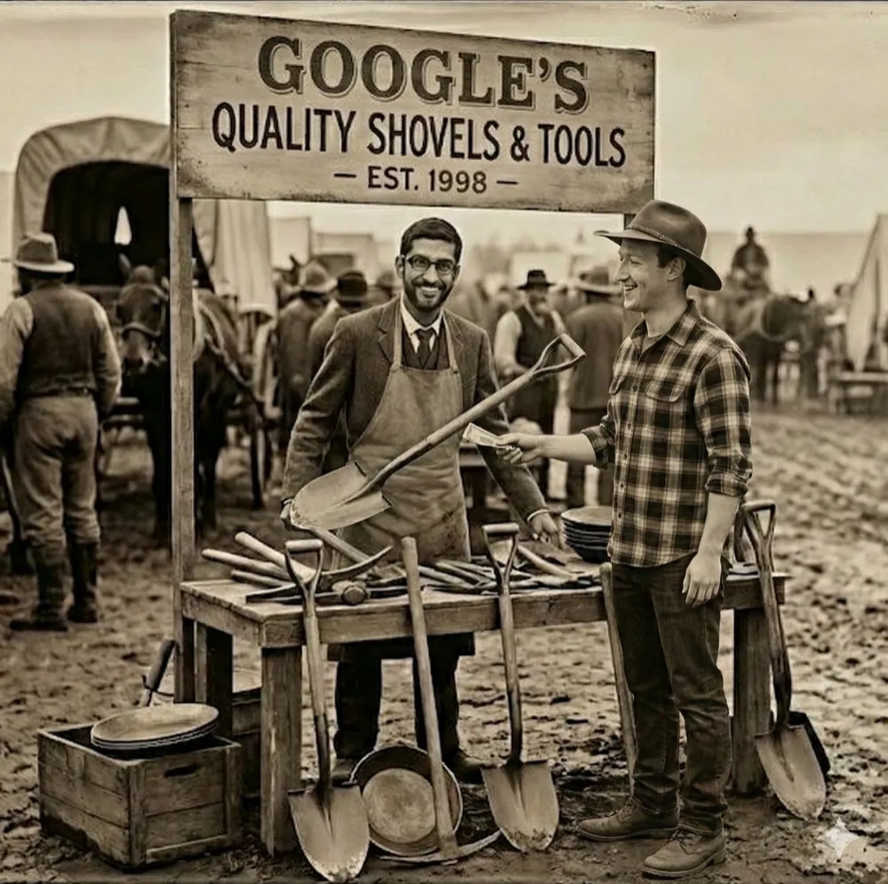 谷歌CEO皮查伊向扎克伯格卖铲子,图片由AI生成