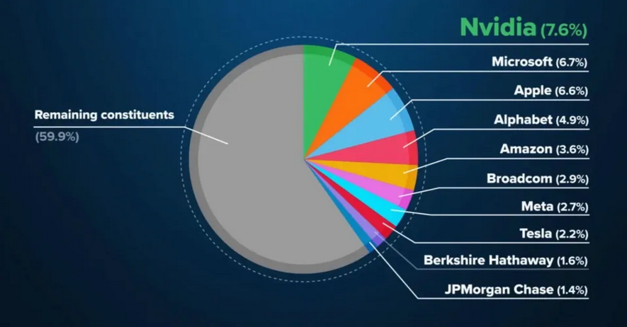 五家公司——英伟达、谷歌、微软、苹果和亚马逊——就相当于标普500总市值的30%。换句话说,投资标普500——一个包含近500家公司、被视为最具代表性的美国经济指标的指数——已经不再提供被动投资者所期望的分散化优势。