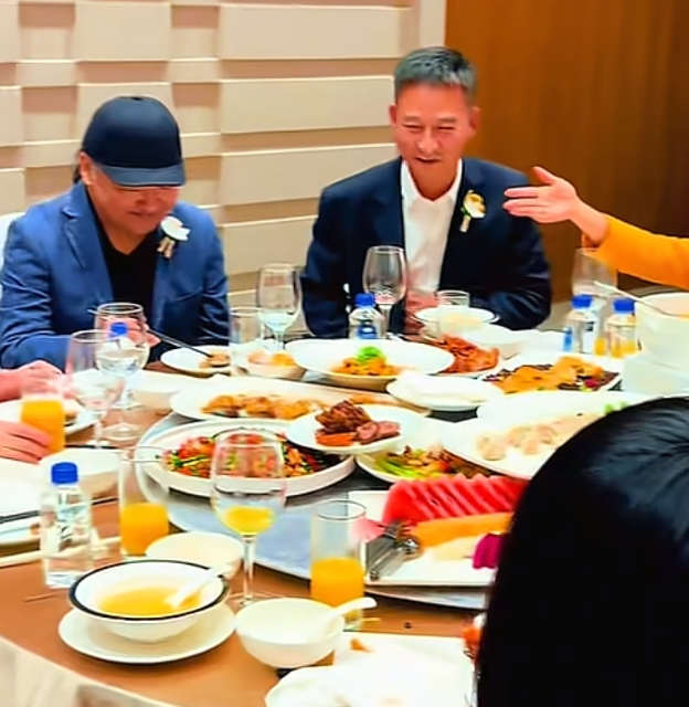 婚礼现场当天,我们能看到刘欢穿着蓝色西服,细密的纹路并不显得年龄颇大的他老气横秋。