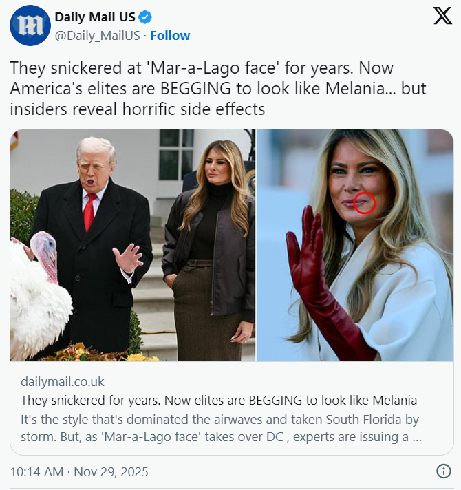 虽然“海湖庄园脸”自从被发现以来,就遭到了不少的嘲讽,但很容易发现它并没有因此而减少,而按照整形医生的说法,这种趋势还在蔓延,甚至一些客户已经开始提要求,有要更像伊万卡的,也有要像梅拉尼娅的。
