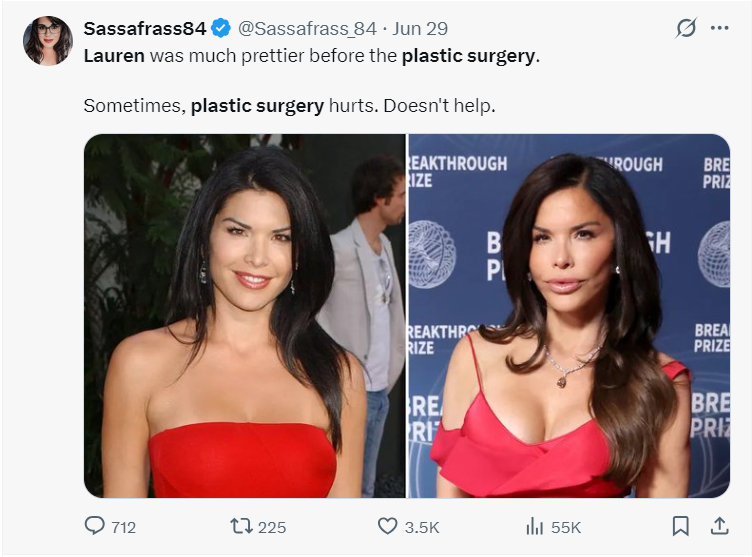 在哈基医生看来,杰夫·贝索斯的新婚妻子劳伦·桑切斯,现在的那张脸就是整容过度的结果,看起来已经不自然了。“如果有人想要永久性的改变,让自己看起来更像社交媒体上的照片,而不是一个真实的人,并且开始扭曲现实的样子,我会告诉他们,‘我认为这不是个好主意’。”