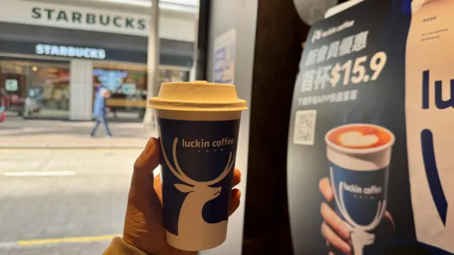 北角电气道的星巴克,正对面就是新开的瑞幸,BBC记者跨过一条两车道的小街,一杯美式咖啡就从38元降到15.9元(新客价);