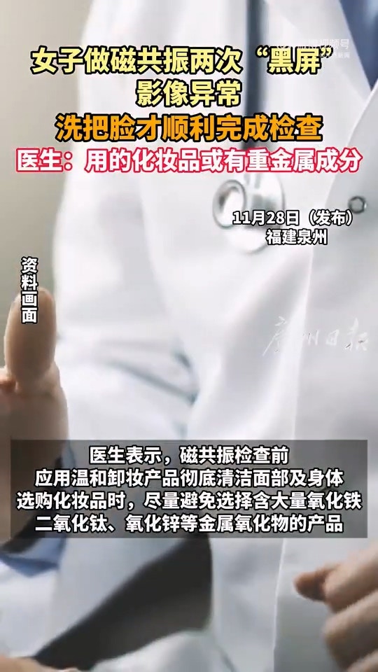 福建29岁女子做磁力共振两次黑屏,竟因化了妆。(微博@九派新闻)