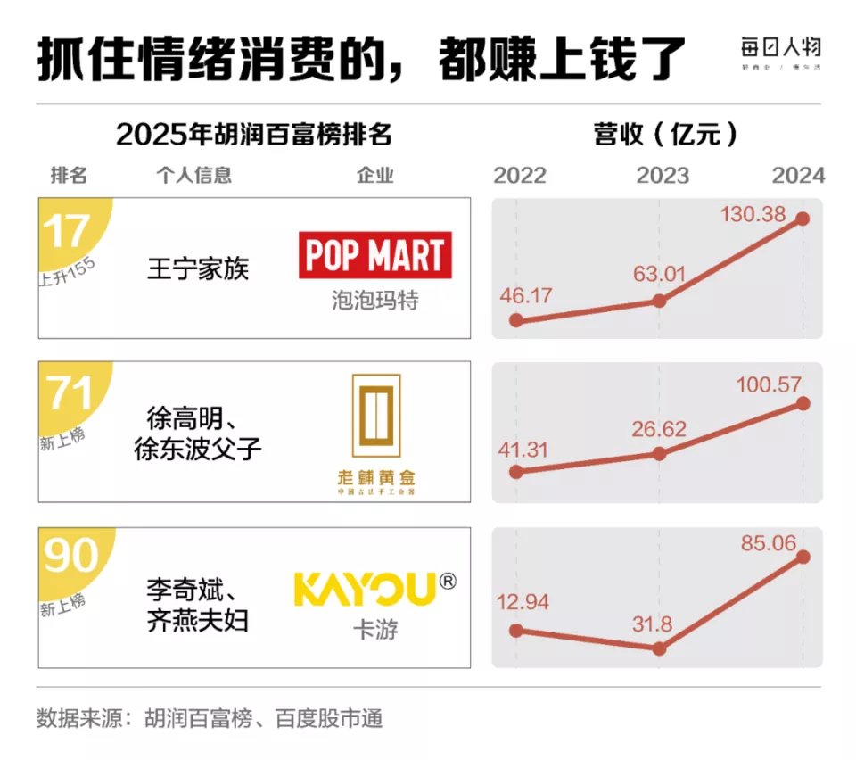 当房地产富豪从财富榜上成批消失,靠“情绪”挣钱的新贵们已经坐上了牌桌——泡泡玛特、老铺黄金、卡游。这些曾被主流资本拒之门外的生意,正靠着为年轻人提供丰沛的情绪价值,划出了收入与利润陡峭的增长曲线,并将它们的创始人一举推上财富榜。