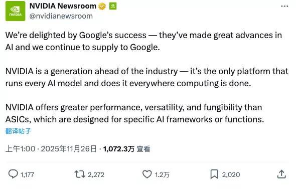 英伟达先肯定了友商的成绩,“为谷歌的成功(指谷歌TPU)感到高兴”,