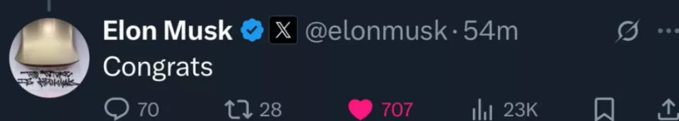 一直对谷歌咬牙切齿的马斯克也破天荒送上了一句“祝贺”(Congrats),精准体现了字数越少,怨气越深。