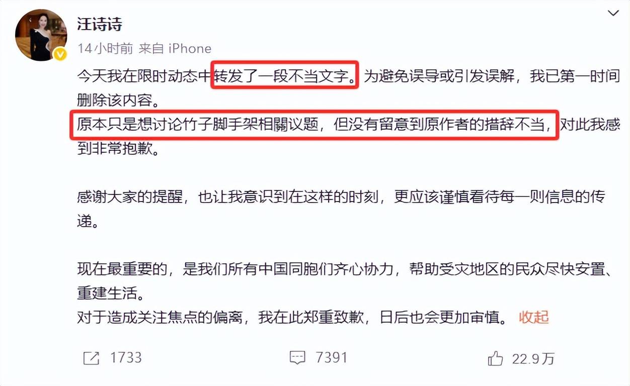 汪诗诗的道歉完全没有诚意,带节奏甩锅的时候她倒是明确,可道歉时却丝毫不提甩锅事宜,一句转发似乎就跟她没关系了。