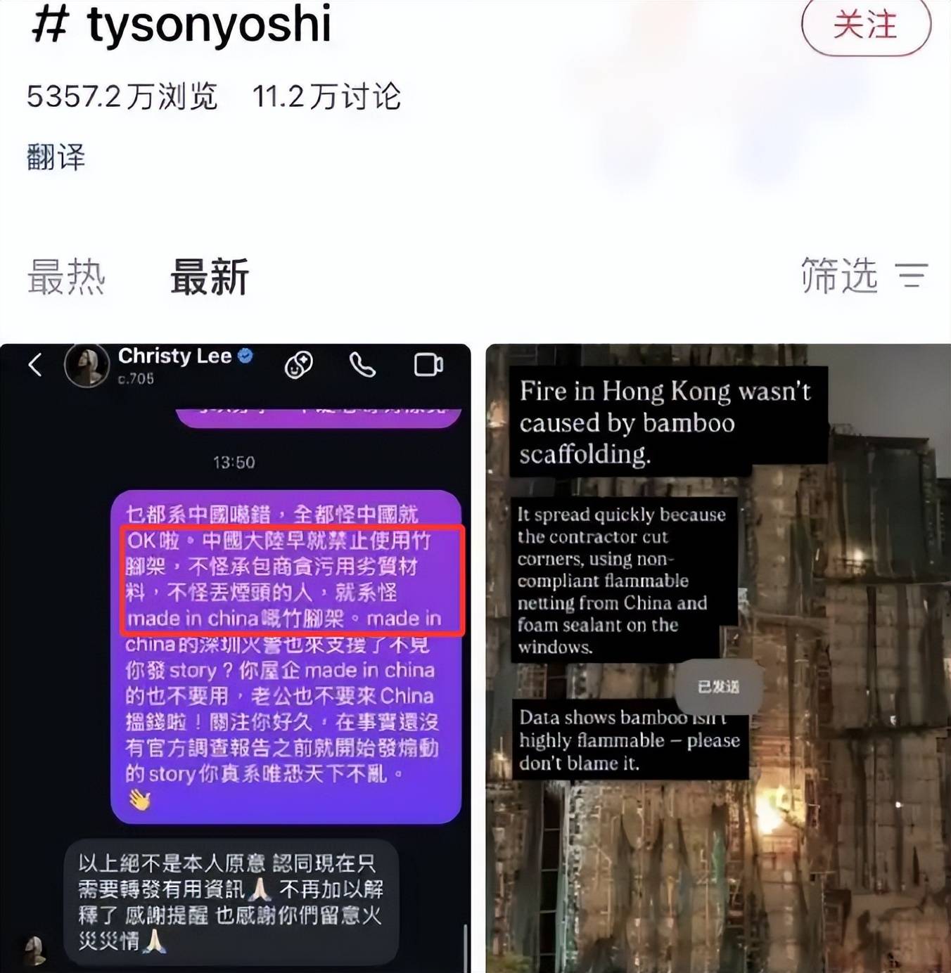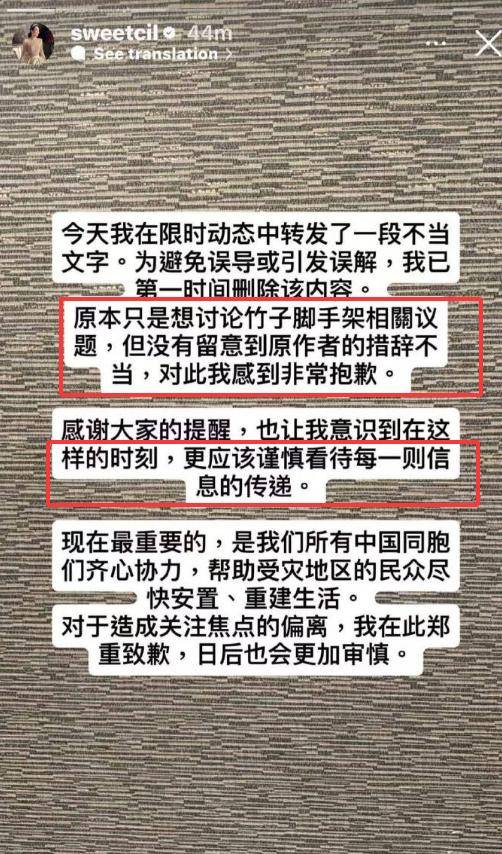 且整段道歉文字里,完全回避了曾经发文中的立场不明,且甩锅内地的问题,将关注点引向了竹子脚手架是否易燃这样的话题上。