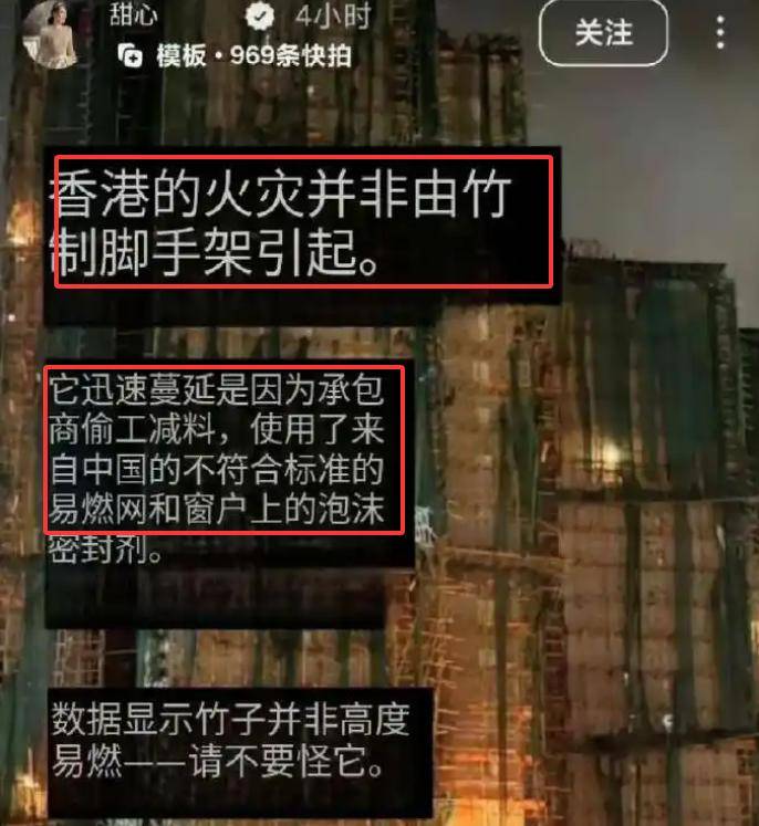 甄子丹的妻子汪诗诗,之前在外网发文:“香港的火灾并非由竹制脚手架引起,它迅速蔓延是因为承包商偷工减料,使用了来自中国的不符合标准的易燃网和窗户上的泡沫密封剂”。