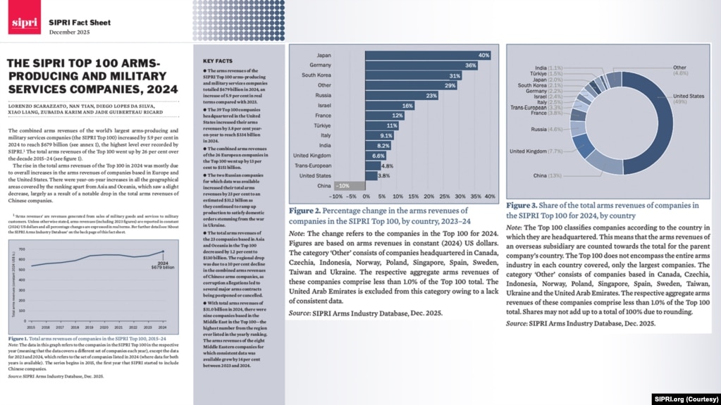 斯德哥尔摩国际和平研究所(SIPRI)全球100强武器生产和军事服务公司2024年总收入报告(图像由美国之音根据SIPRI报告制作)。