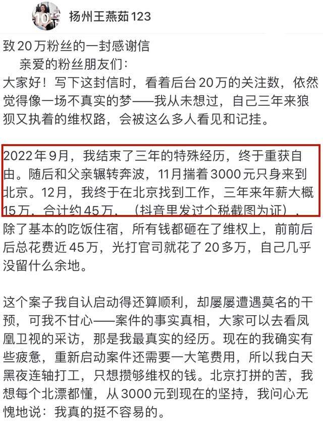 文案中,王燕茹透露,她从22年出狱之后,便和父亲辗转奔波,当年的11月份便揣着3000元前往那个北京打拼,一个月后,她终于在北京找到了工作,这三年下来,她学会了很多,不但成为一名非专业的法律人士,更获得了工作后的报酬。