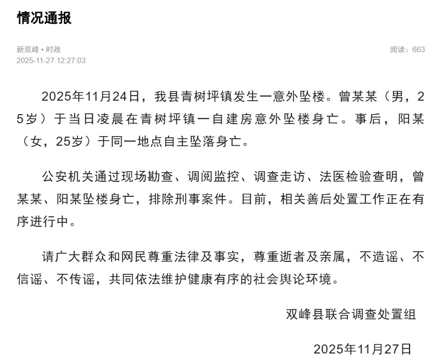 2025年11月24日,我县青树坪镇发生一意外坠楼。曾某某(男,25岁)于当日凌晨在青树坪镇一自建房意外坠楼身亡。事后,阳某(女,25岁)于同一地点自主坠落身亡。