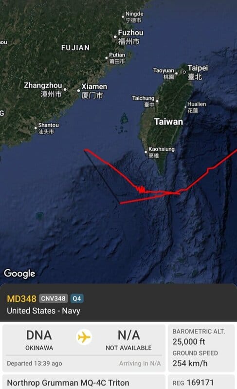 美国最新民调,60%民众同意美国政府承诺美军直接参与台湾(专题)防卫。图为美军无人机在台湾周边侦察巡弋。 图:翻摄「X」@Oceanworldfree