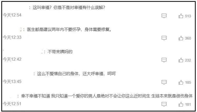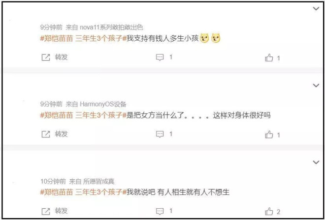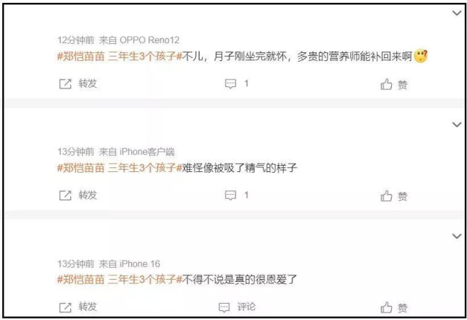 ——有人觉得就算是明星也无法避免生育损伤,苗苗三年抱三,二胎生了三个月就怀上了三胎,他们自己都自觉理亏不愿公布,外人确实没资格管明星生几胎,但吐槽一下总可以吧?
