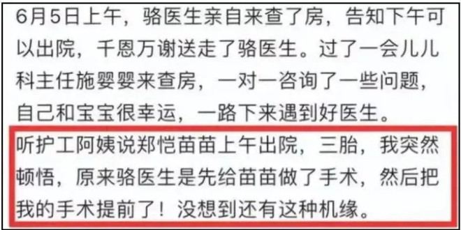 倒是有一条爆料可以互相验证,就是有人提到苗苗三胎早产臀位开刀,和孕妇口中的“骆医生先给苗苗做手术”的说法对上了。