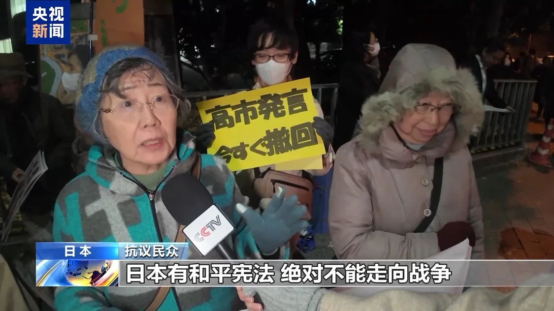 抗议民众:日本有和平宪法,绝对不能走向战争,我认为必须回到这一点上来。我只能说,(高市早苗)立即停止,立即撤回发言,谢罪并辞职,承担责任。