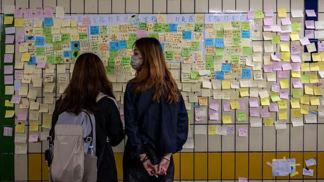 图像来源,GETTY IMAGES图像加注文字,2025年12月1日,香港大埔宏福苑附近的一条行人隧道墙上,人们贴上手写悼念便利贴。