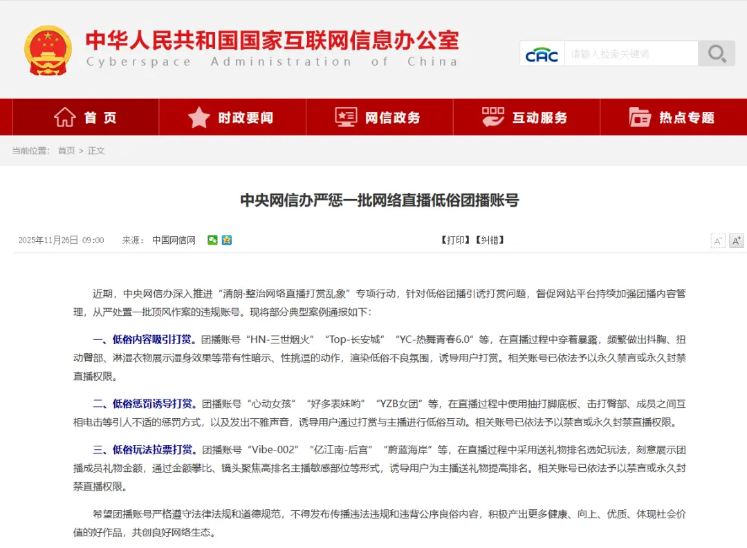 诸如“HN—三世烟火”“心动女孩”“亿江南-后宫”等利用低俗内容、惩罚或玩法引诱打赏的团播账号,已被依法予以永久禁言或封禁直播权限。