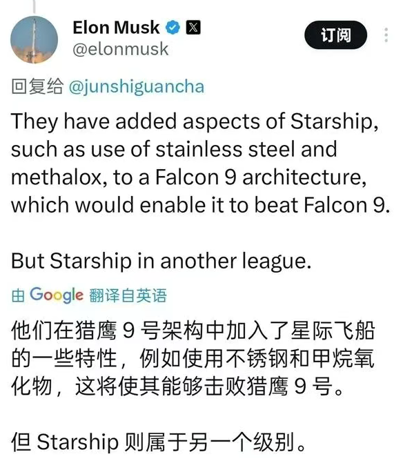● 马斯克在社交平台发表对朱雀三号的看法